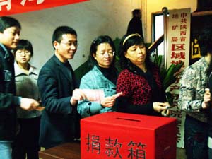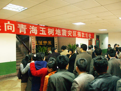 4月19日下午, 區研院黨委及工會根據上級精神,及時安排部署向玉樹地震災區捐助活動。各分會認真組織動員,向大家詳細介紹災情。4月20日上午10:00,在辦公樓一樓大廳舉辦了以 “向青海玉樹地震災區獻愛心”為主題的大型募捐活動,院領導帶頭,廣大干部職工紛紛伸出友愛之手,慷慨解囊,以實際行動支援地震災區人民群眾渡過難關,共有206人,捐款 18095元。現場涌動著一片融融真情。人群中,既有在職的干部職工,也有離退休的老同志、還有部分家屬。有的院領導、干部職工因公出差等原因不能前往現場,特地委托同事或家人代為捐助。區研院人為災區苦難中的血肉同胞們奉獻上了一片愛心,拋灑出了一片真情。