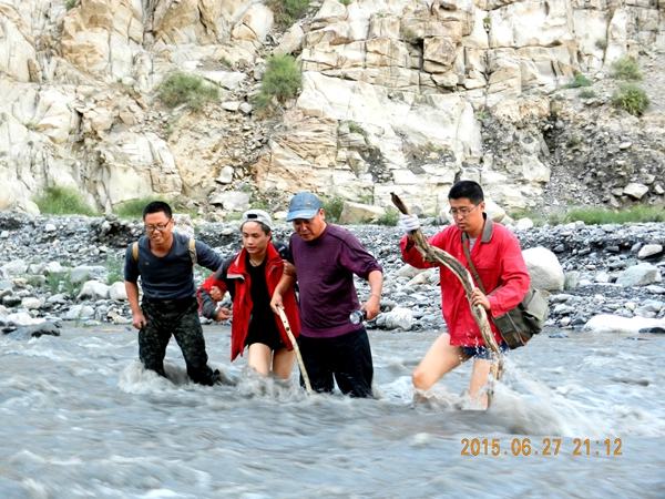 晚上8點半,全部人員到達大河邊。此時距離車輛還有6公里左右的路程,道路完全沖毀,需要過7次河。面對湍急渾濁的河水,大家心里不由得一涼。車就在不遠處,駐地有熱乎乎的飯菜和舒服的床。但是河水實在太大太急。過河有危險,不過河也不行。大家在一起討論了很久,最終決定過河。在河岸來來回回走了好幾次,最終選好渡口,項目負責馮曉強身先士卒,脫掉褲子,拿起河灘上的枯樹枝,穩健地踏入冰冷的河水,一步一步慢慢地摸索著前進。大家都盯著他,只見他離河中心越來越近,突然,河中心泛起了一朵朵白浪,河水打著漩兒。馮曉強的身形一晃,“壞了!他要倒。準備救人!” “不!他穩住了。”大家松了一口氣。只見他繼續向河中心進發,慢慢地到了河中心,穩住身形向河對岸艱難地前進,終于到達了淺水區。接著,大家在馮曉強的指引下,一個接著一個,平安地渡過了河。楊西明今年50多歲,身形單薄,只見該老漢老當益壯,過河時穩穩當當,事后被譽為“技術流過河”。年輕小伙程犬身形瘦小,快到河心時險些被沖倒,但是依然頑強前進,順利渡河。渡過一道河,大家信心倍增。隨后相互配合著,順利渡過第二道河、第三道河、第四道河……