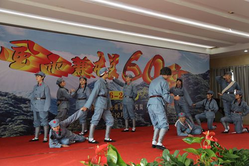 慶典文藝活動由區研院職工和總公司老年藝術團聯袂同臺演出,節目形式多樣,內容精彩豐富,男女對唱《我愛你.中國》、舞蹈《我的長征》等紅色節目以飽滿的熱情歌頌了區研院人在黨的領導下,不畏艱難,艱苦奮斗最終開創了如今新局面。小品《雷鼓山的故事》則回顧了院艱苦奮斗的創業史,真實地反映了老一輩地質人為祖國尋找寶藏獻出生命悲壯故事。《酒神曲》、《賽馬》、《出水蓮》則表現了年輕人豪情壯志和溫婉細膩的精神風貌。整個現場氣氛熱烈,掌聲四起。