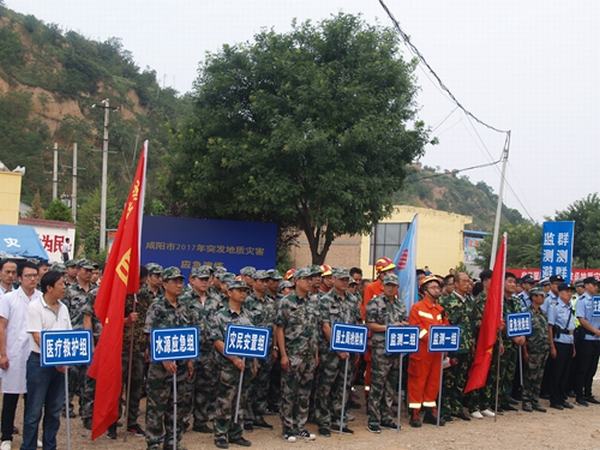 為了認真貫徹落實《地質災害防治條例》,強化地質災害防治宣傳工作,提高群眾的防災避險意識,鍛煉隊伍的快速反應和協同作戰的救援能力。8月1日,咸陽市應急管理辦公室、咸陽市國土資源局、彬縣人民政府在彬縣太峪鎮景村舉辦咸陽市2017年突發性地質災害應急演練,咸陽支隊作為重要參與單位受邀承擔了現場災情排查、監測任務。本次演練還邀請到了省國土資源廳領導到場指導,咸陽市其他12個縣區國土資源局代表也前來觀摩、學習。咸陽支隊長邢憲龍在新疆野外檢查工作期間也多次打電話密切關注演練的進展情況,并囑咐大家要克服困難,集中精力,確保演練取得成功。