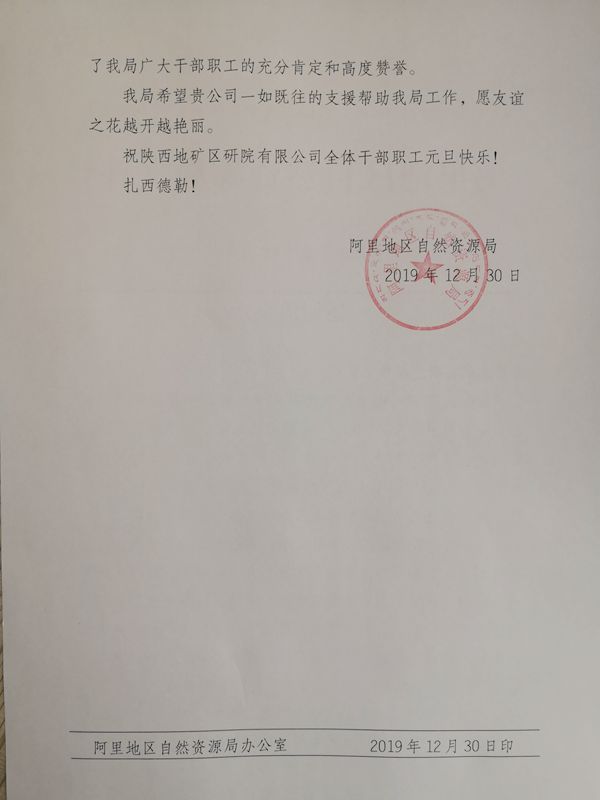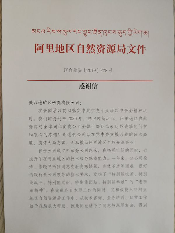 12月30日,我公司收到西藏阿里地區自然資源局發來的感謝信。對該單位胸懷大局意識,發揚老西藏精神,無私援助阿里地區自然資源事業進行感謝,并表達了進一步加強合作的期望。